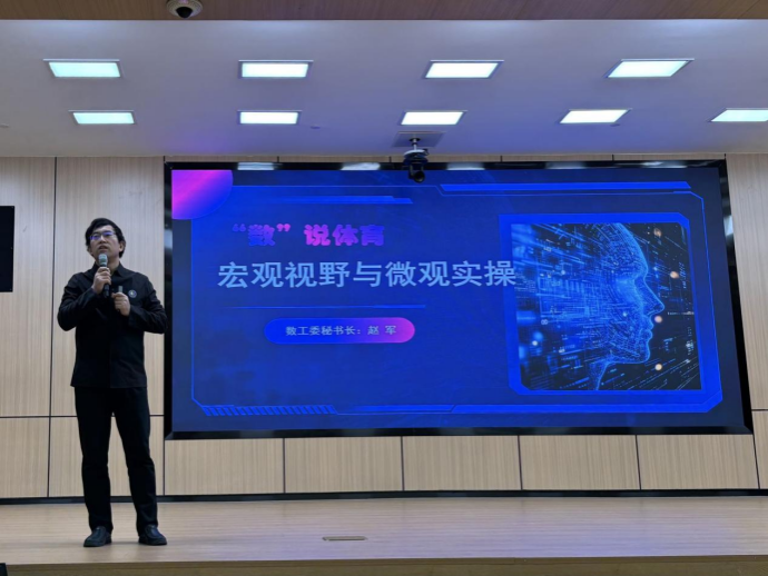 在图书馆第二报告厅,赵军教授以“‘数’说体育:宏观视野与微观实操”为题,结合近二十年从事数字体育经历,介绍了数字体育目标对象,概念范围,着重强调了数字体育在体育团队建设方面的重要作用。在落地应用方面,赵军教授以数字体育工作委员会为例,介绍了数字体育“五一”工程:数字体育平台,为数字体育教材、数字体育非遗提供支撑,同时作为AI助手,为作者和编者提供赋能;《数字体育研究》辑刊,是专门开展数字体育研究的平台,正在编辑出版,鼓励师生投稿;数字体育项目,即全国各省每月份可申报的项目,以项目地图形式展示给师生,结合数字体育探寻申报方向;数字体育大会,展示每年数字体育工作委员会所支持的项目成果,公布第二年工作计划,便于全国高校教师参与;数字媒体赋能,即通过国家级媒体矩阵,为高校体育举办学术会议、大型活动提供发声渠道,提升口碑品牌。