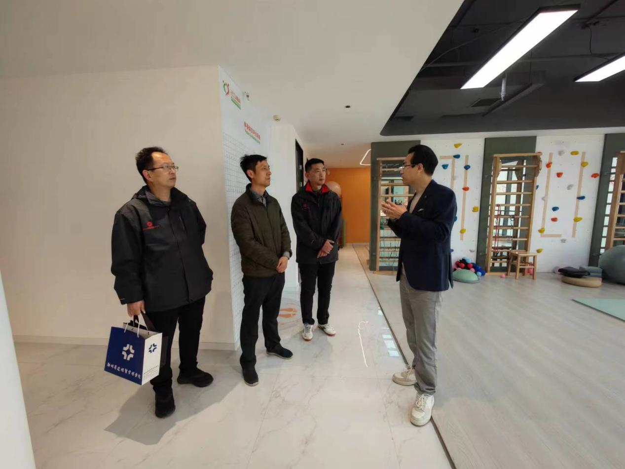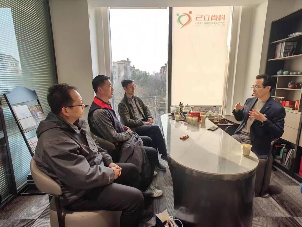 己立脊科健康管理有限公司负责人冯俊伟对李书记一行的到来表示热烈欢迎,并带领李松涛书记一行参观了己立脊科金水建业总部港店。在参观过程中,冯俊伟就公司的创办理念、发展历程、专家团队、用人需求、企业的福利待遇等具体情况进行详细介绍,并希望能发挥企业的优势,实现资源共享,互利共赢,协同育人的目标。