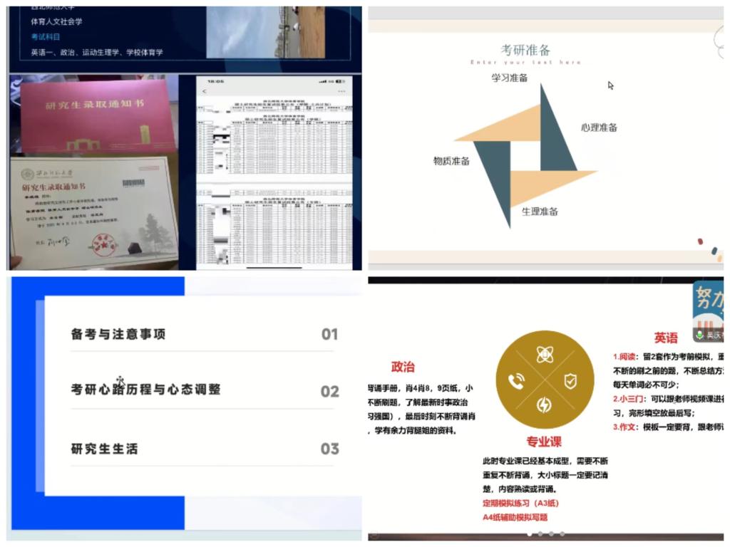 2023年11月9日,在考研竞争日益激烈的背景下,为了帮助员工明确考研目标、掌握考研技巧,beat365社体教研室成功召开了一场线上考研经验分享交流会。此次交流会邀请了考研成绩优异的四位学长学姐,与正在备考硕士研究生考试的2024届同学分享他们的备考经验和心得。本次会议由社体教研室主任李英豪老师主持。