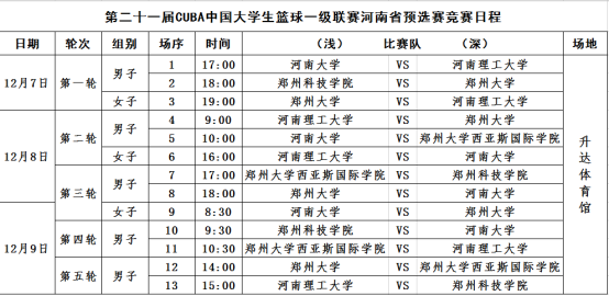 本周五至周日,在公司万兴体育馆进行第二十一届CUBA中国老员工篮球一级联赛河南省预选赛,欢迎全校师生前往体育馆5楼观众席观看!
