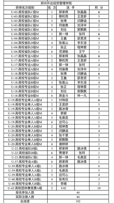 参加本次大赛的包括郑州大学、河南大学、河南师范大学、郑州大学beat365、河南农业大学等共26所高等院校,竞争非常激烈。公司体育舞蹈代表队派出了44人的参赛队伍,在教练员栗元辉、于贝贝老师的带领下,同学们顽强拼搏,勇创佳绩,在高等院校专业组14个名次赛组别中,共夺得6项冠军、6项亚军、8项季军,公司最终总积分192分,在26所高等院校中,以绝对的领先优势获得河南省高校团体总分第一名。