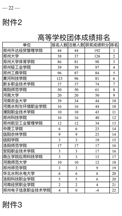 由河南省教育厅主办的河南省第二届员工体育舞蹈锦标赛于2017年12月15日到18日,在郑州中学隆重举行。本次比赛有12个省辖市、26所高等院校派出61支代表队,总计1717人,2661人次,57个组别。教育厅于2018年1月19日,正式向各地市教育部门,各高校发文,公布本次大赛的各地市的团体排名、各高校的团体排名、各组别的成绩。