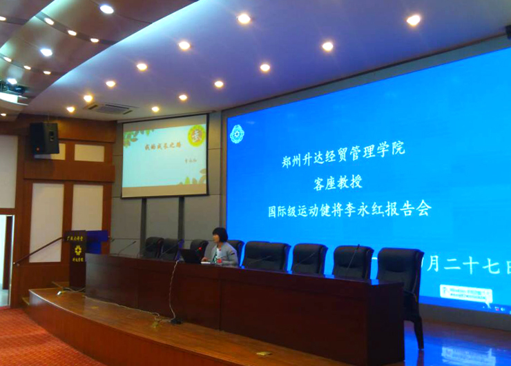 受公司体育系邀请,中国首位女子散打世界冠军、一级教练员李永红女士莅临公司出席运动会开幕式,并在国际会议厅作《我的成长之路》主题报告。报告会由体育系教师丁英俊主持。