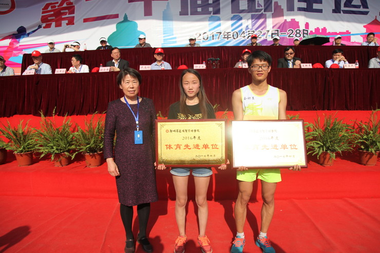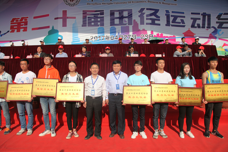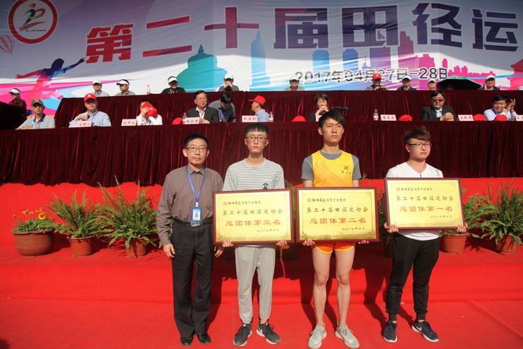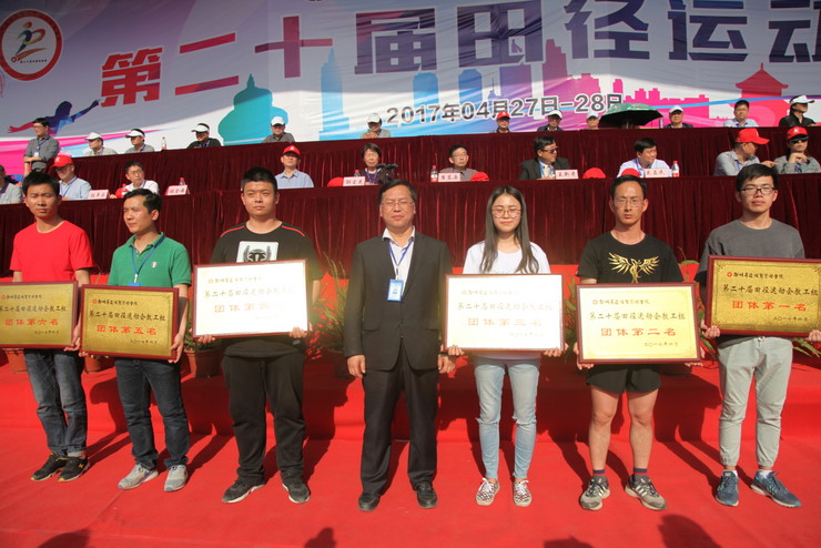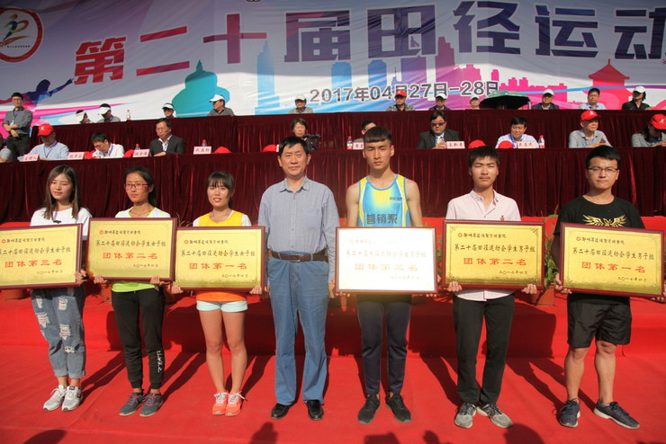 闭幕式上,体育系主任张王利公布比赛结果。获得员工组男子团体奖:第一名金贸系、第二名会计系、第三名商学系;获得员工组女子团体奖:第一名金贸系、第二名会计系、第三名商学系;获得田径运动会总团体奖:第一名会计系、第二名金贸系、第三名商学系。另外,商学系和管理学系获得最佳风貌奖;文法系和信工系获得秩序礼仪奖;文法系和管理学系获得整洁卫生奖;外语系、建工系和艺术系获得体育道德风尚奖;文法系和管理学系获得宣传报道奖;体育系获得安置最佳贡献奖;建工系和商学系获得优秀组织奖;艺术系和外语系获得最佳仪仗队奖;会计系陈刚、金贸系闫帅、商学系郭峰、管理系许广庆、体育系高建涛五位老师获得“体育先进工作者”称号。 与会领导为获奖集体颁奖并合影留念。