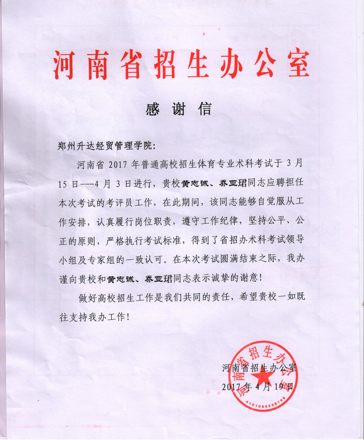 4月19日,河南省招生办公室向公司发来感谢信,感谢公司体育系黄志诚、乔亚珺老师在应聘担任河南省2017年普通高校招生体育专业术考试中的上佳表现。