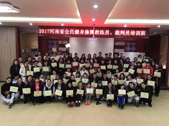 2016年12月21日到27日,2017年河南省啦啦操、全民健身操舞教练员裁判员培训班在郑州市青龙山庄成功举办。来自全省各地市大中小学的200余名教师参加了此次培训,其中大部分参培人员是本校健美操、啦啦操专业带队教练,公司体育系张晓丹老师应邀参加。本次培训班由全国啦啦操委员会、全国全民健身操舞推广委员会联合主办,由河南省啦啦操委员会、河南省员工体育总会健美操协会承办。经过主办单位、承办单位前期大量的沟通、协调和筹备,为期七天的培训活动圆满顺利结束。