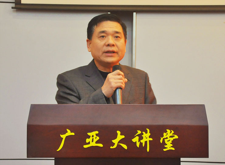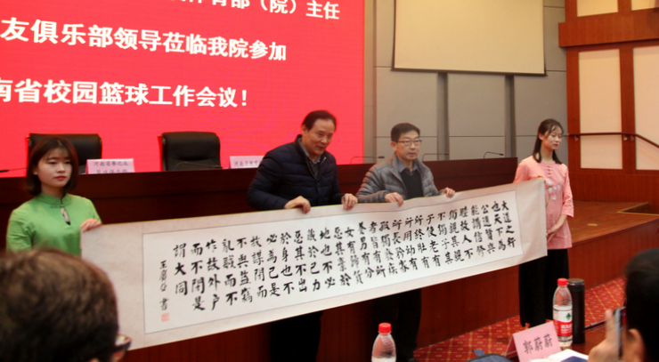 而后,公司常务副经理崔慕岳向河南省教育厅赠送创办人王广亚书法卷“大同篇”,并受教育厅领导邀请做了即兴演讲。崔副经理说,一所高校,如果不重视体育或者做不好体育工作,那么这个大学教育是残缺的,是不完整的。他分别从身体——安身立命之本、精神——超越创新和永不言败、政治——最能激发国民的爱国热情三个层面剖析了体育教育的意义。最后,崔副经理讲到,体育对大家来说不仅仅是一项工作,它还是一番事业,一门科学,也是一门艺术,希望大家重视体育,把公司体育工作做扎实,把我们的校园篮球工作做好。