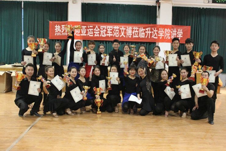 亚运冠军范文博能在百忙之中应升达经贸管理公司之邀前来为同学们讲课,让同学们感受亚运冠军风采,聆听名师教诲。最后范文博老师和大一体育系体育舞蹈员工合影留念,并激励学员努力学习、掌握技巧,成长为明日赛场上的冠军。(供稿 栗元辉 )