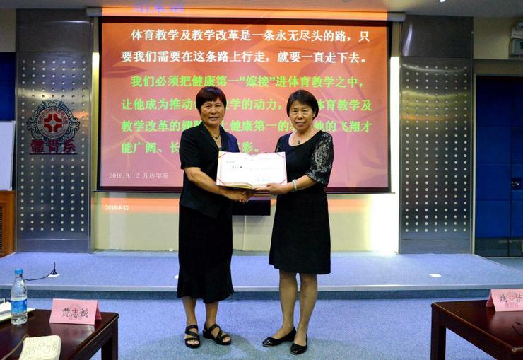 会上,首先,王小美教授介绍了体育教学的八大基本要素,并详细分析每一个要素的重要性。王小美教授讲到体育教师是体育教学中的主导因素,也是内在的掌控因素。其次,针对体育教师这一职业引出了“体育教学设计”“体育课堂教学”等一系列观点,她用自身实例及生活所悟在轻松愉悦的氛围下让全体师生对其有了进一步的了解,明确了新时期体育人的共同责任和基本要求。其激昂的讲学使现场气氛热烈无比,掌声不断。最后,郭爱先经理为王小美教授和姚洁教授颁发了公司“客座教授”的聘书,为此次学术报告讲学画上了圆满的句号。