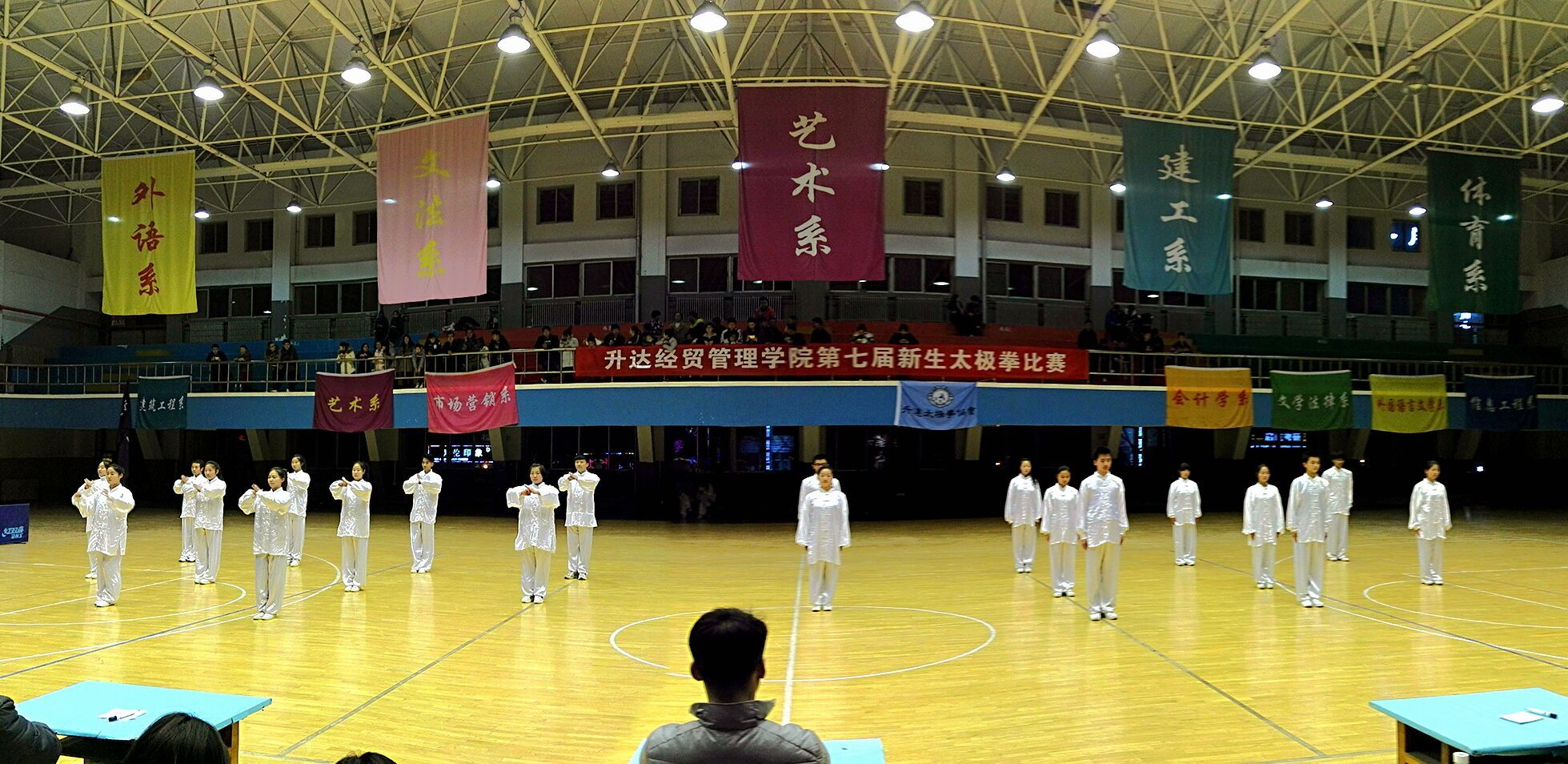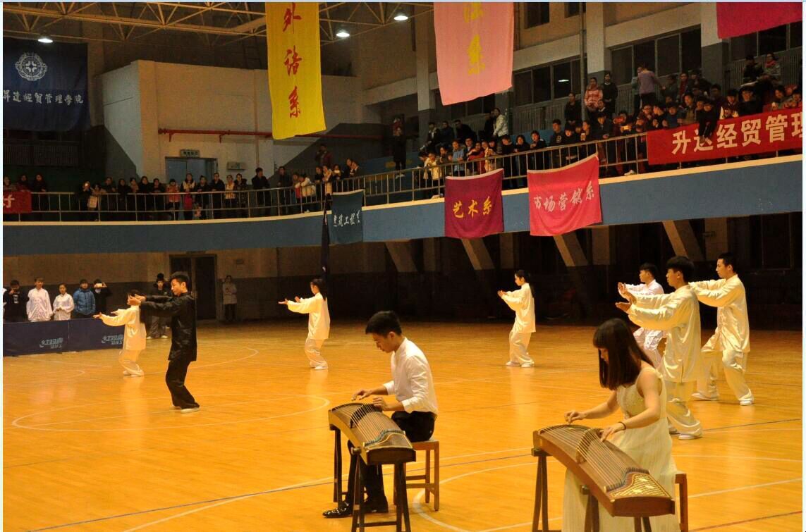 决赛开始时,体育馆可谓热闹非凡,看台上的同学们个个欢呼雀跃,加油声此起彼伏。今晚的开场表演更为精彩,是由院太极拳协会会长李展翼同学携其六名优秀弟子为大家带来的“太极风云”,可谓是震撼全场,让同学们深深领略了太极的内涵。由艺术系王振铎,付玉婷带来的古筝表演,赢得在场观众的阵阵掌声。接下来,便是扣人心弦的比赛了,比赛过程中,参赛选手们身着白衣,不紧不慢跟着节奏,认真做好每一个动作,每一招式都很到位。比赛的氛围感染着在场的每一位同学。除了正在比赛的同学,在后面准备的同学也是跃跃欲试,听着音乐,熟悉每一个动作,参赛选手之间相互提醒,相互纠正,共同努力,体现了同学间的团体合作精神。此次比赛的宗旨是:赛出风格,赛出友谊。更是要同学们记住太极拳协会会训,练拳的初衷:练拳练心练做人,学艺学道学感恩。我相信,通过这次比赛,同学们更加深刻的理解了这句话的含义。