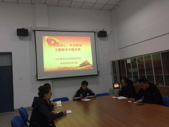 10月25日下午13时,社体支部全体党员开展学习“不忘初心、牢记使命”主题教育专题党课活动,此次活动主要由建工体公司党总支宣传委员白洋老师、社体支部书记孟俊鸟老师为大家讲授主题教育党课。