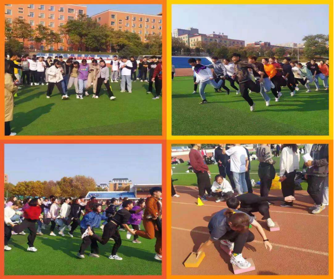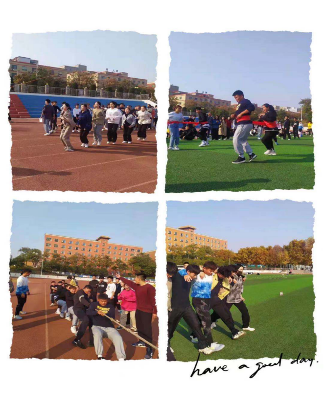 在拔河比赛中,随着比赛的哨声响起,同学们热情高涨,口中齐声高喊“一二”、“一二”,脚下节奏一致。双手紧握长绳,卯足了劲拼命拔。呐喊声此起披伏,飘荡在整个操场上空。在旋转接力赛中,虽然参赛同学都头晕转向,可是听到同学们的加油助威声,又有了奋勇向前的动力。因为这不是一个人的比赛,这是为班集体而战,赢与不赢,士气不输。摸石头过河比赛以20米的长度为标准,考验参赛者的毅力,在不断坚持中取得胜利。齐心协力小火车项目增强了同学们之间的相互协作意识,锻炼了他们坚韧不拔的意志,展现了体院学子拼搏向上的精神。六人七足项目更体现了同学们团结一心的精神面貌,脚绑脚,手挽手,肩并肩,步调一致竞走在赛场上,尽显风采。团体跳绳项目同样提升了同学们之间的凝聚力,使大家切实体会到不抛弃不放弃坚持到底的精神魅力。