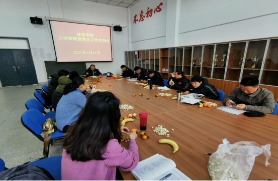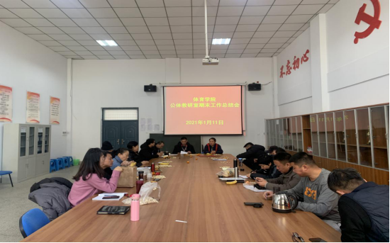 2021年1月11日,公共体育教研室在beat365会议厅召开期末工作总结会,经理张王利,公司党总支书记杨明志出席了本次会议,会议由教研室主任巴义然老师主持,全体公共体育教研室教师参加。首先,党总支书记杨明志对本学期公共体育教研室的工作给与高度肯定,感谢公共体育教研室全体教师的辛勤工作,希望大家在学期期末阶段继续做好成绩输入、资料归档等方面的工作,并提醒大家假期防疫不松懈,做好自我防护。