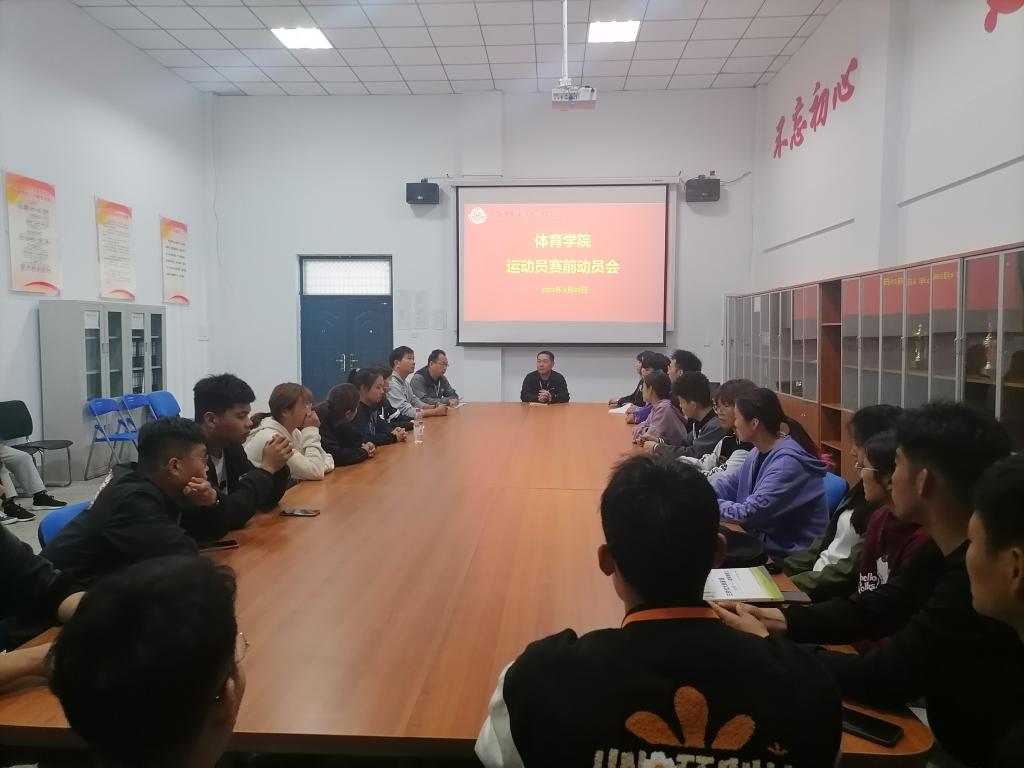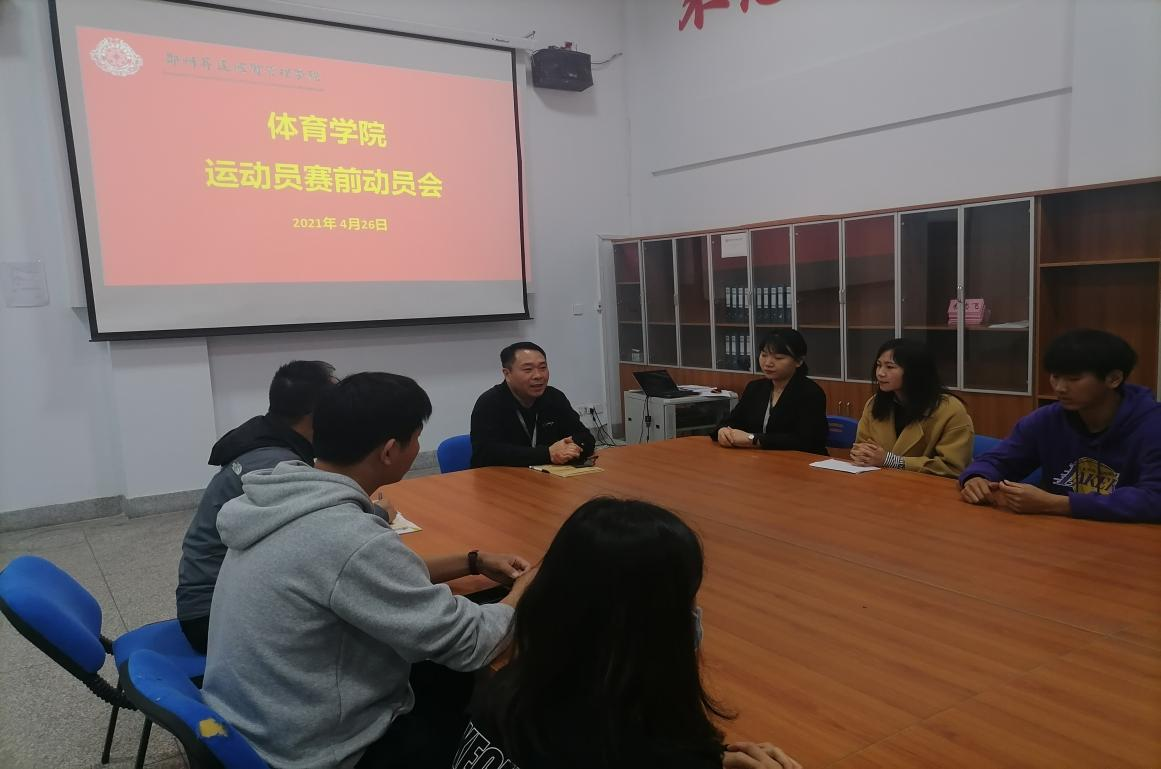 在春季运动会即将到来之际,为充分调动运动员的积极性,同时保障beat365各项服务工作有序进行,2021年4月26日中午,beat365于体育馆会议室召开运动员赛前动员会。会议由beat365团委书记高建涛主持,党总支书记杨明志、全体辅导员、院员工会骨干员工以及所有参赛队员参加了此次动员会。