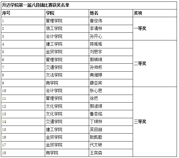 本次八段锦比赛截止20日共有10个院系50名运动员参加,比赛共分两个阶段:第一阶段,各参赛单位对本单位参赛员工自主录制的视频进行评选,遴选出5人进入第二阶段的评比;第二阶段,由beat365指定的评委对各参赛单位推选出的参赛队员进行评选。最终评出一等奖3人,二等奖6人,三等奖9人。