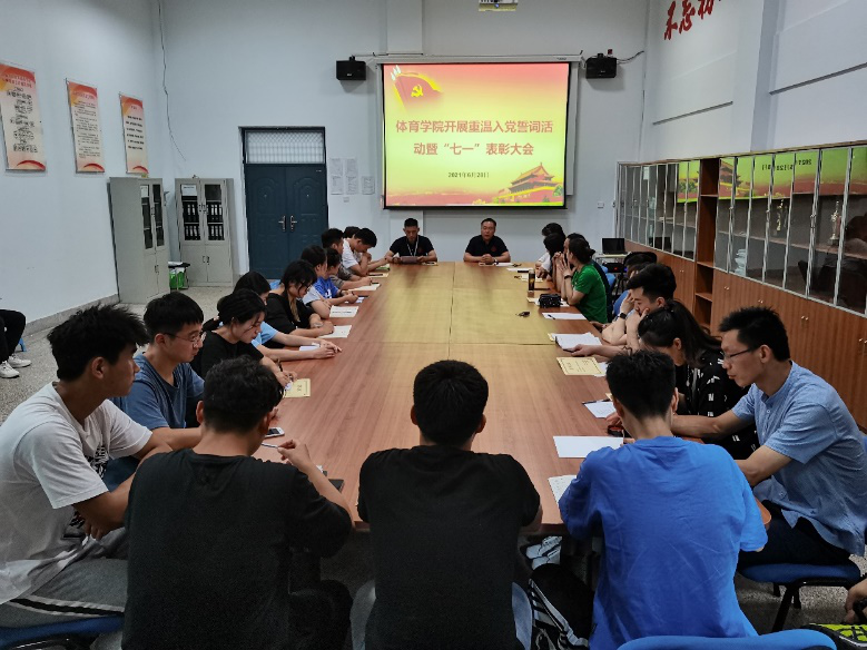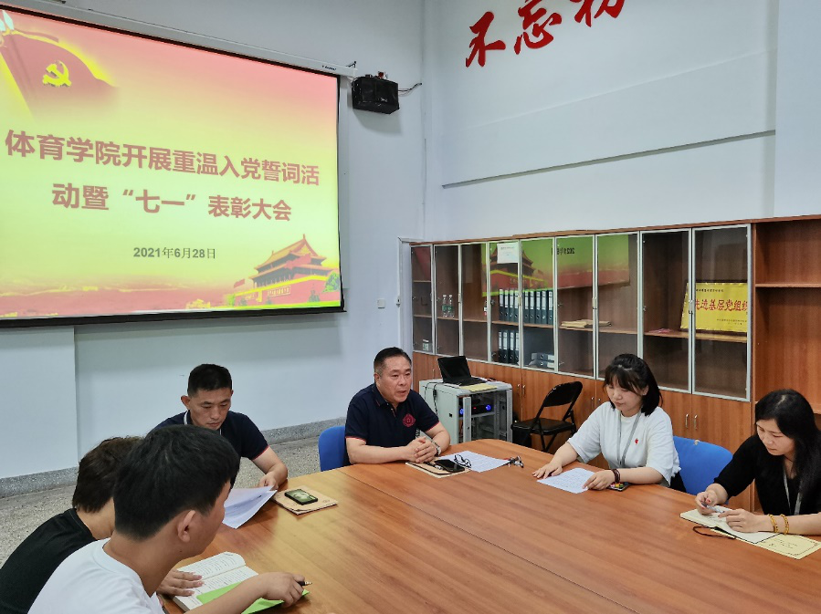 为隆重庆祝中国共产党成立100 周年,大力营造爱党、信党、跟党走的浓厚氛围,彰显党的强大凝聚力号召力,树立先进典型,发挥榜样力量,推动基层党建工作全面发展,6月28日下午,公司党总支于体育馆会议室开展了重温入党誓词活动暨“七一”表彰大会。参会人员有:公司党总支书记杨明志同志,公司党总支副书记、经理张王利同志,beat365教工党支部支部书记、社体教研室主任孟俊鸟同志,公司党总支宣传委员孙秋阳同志,以及教工党支部、员工党支部的全体师生党员。