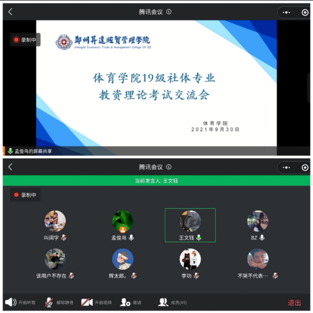 9月30日下午13:30,由社体教专业组织的教资考试交流会通过线上的方式在腾讯会议上召开。参会人员有2019级社体专业参加教团队格证考试的同学,会议由社体教研室主任孟俊鸟副教授主持。