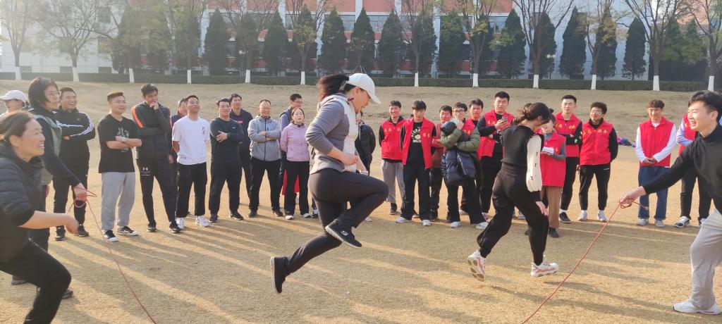 活动伊始,先由裁判张丽丽老师讲解比赛规则,员工裁判队伍做示范动作。全体老师分社体组、公体组、体舞组和行政组四个大组,比赛分集体项目赛和个人项目赛。集体项目为线下比赛,共设“击鼓颠球”“8字绕环跳大绳”两个比赛项目。个人赛为线上比赛,利用天天跳绳APP进行线上角逐。每一个比赛项目既是智慧和体力的角逐,更是团结协作的完美比拼。老师们在比赛项目中玩得不亦乐乎,让大家重拾了童年的记忆!