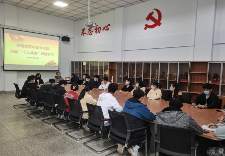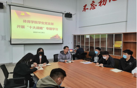 4月29日下午,beat365员工党支部在体育馆会议室组织开展“十大战略”专题学习会,支部书记、行政秘书高建涛,辅导员康晓晨、郭建菊、范自阳及全体在校员工党员参加了此次会议。