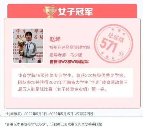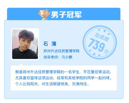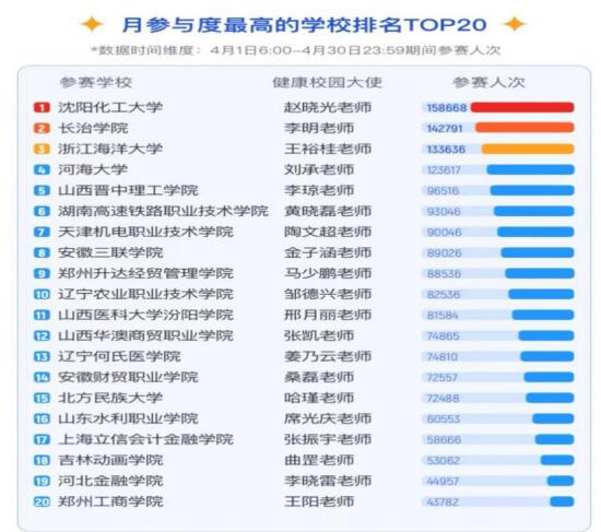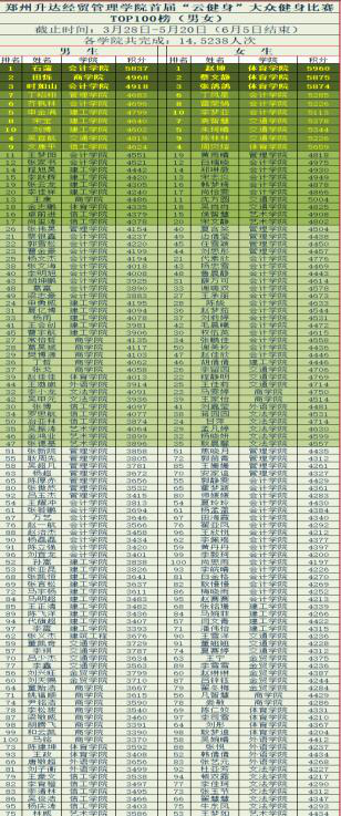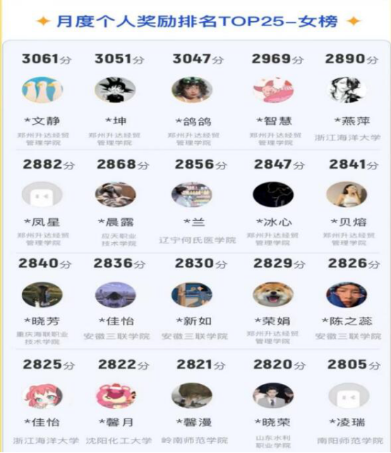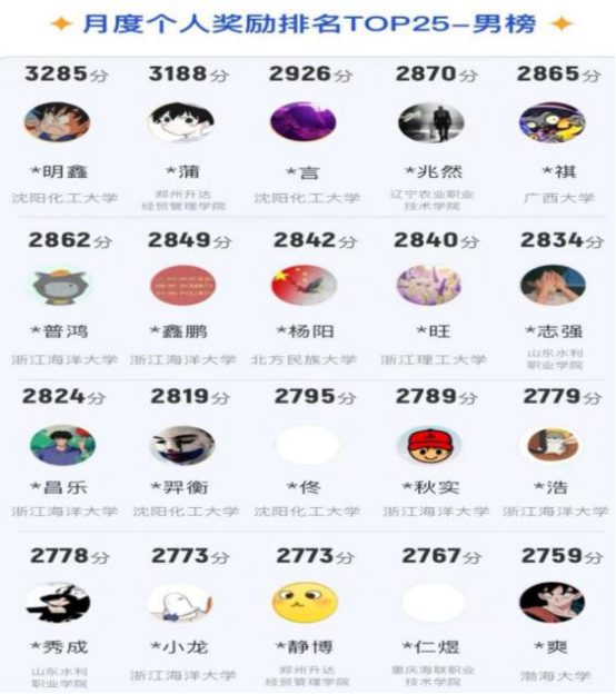 公司9000余名参赛同学来自11个公司,累计参赛14余万人次。在本周官方公布四月份比赛结果中显示:公司名列全国第九名;男子组,会计公司21级石蒲同学获得全国第二名;女子组,beat36519级的蔡文静、赵坤、张鸽鸽包揽全国女子前三名,共7位女生进入全国前十。全国男女前100名分别有19和28名队员来自升达队。以上同学分别来自体育、会计、建工、艺术、管理、信工和交通等公司。