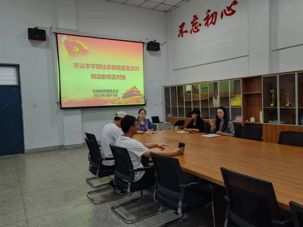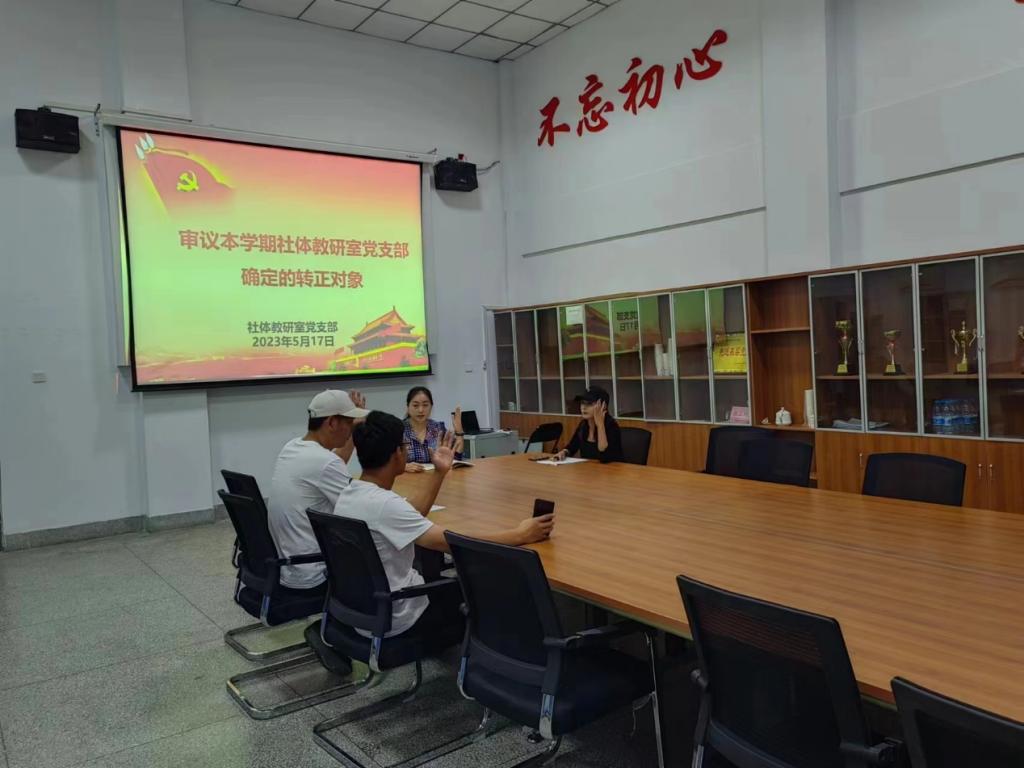 2023年5月17日中午,beat365社体教研室党支部召开了预备党员转正会议,本次会议采用线上线下相结合的形式进行。会议由社体教研室党支部书记孟俊鸟主持,支部共有9位正式党员,其中6位党员参加了会议,符合预备党员转正章程要求。