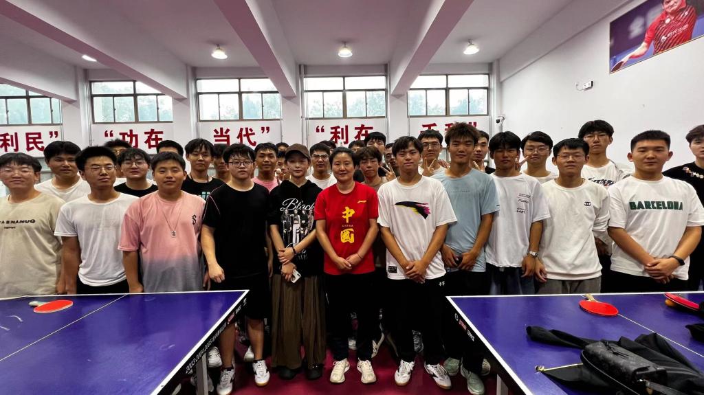 参访过程中,张辉与正在训练的校乒乓球队队员进行了交流并合影留念。