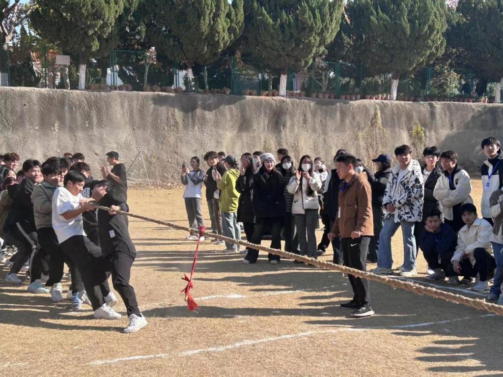 比赛在众人的欢呼声中拉开帷幕,各队选手以默契的配合和高昂的士气全力以赴,握紧长绳,使出浑身解数将长绳向自己队伍的方向拉扯。同时,场外的同学们的加油助威声此起彼伏,他们的呐喊声激起了选手们的激情和必胜的决心,使比赛的气氛更加热烈,营造了一个欢快且充满活力的活动氛围。
