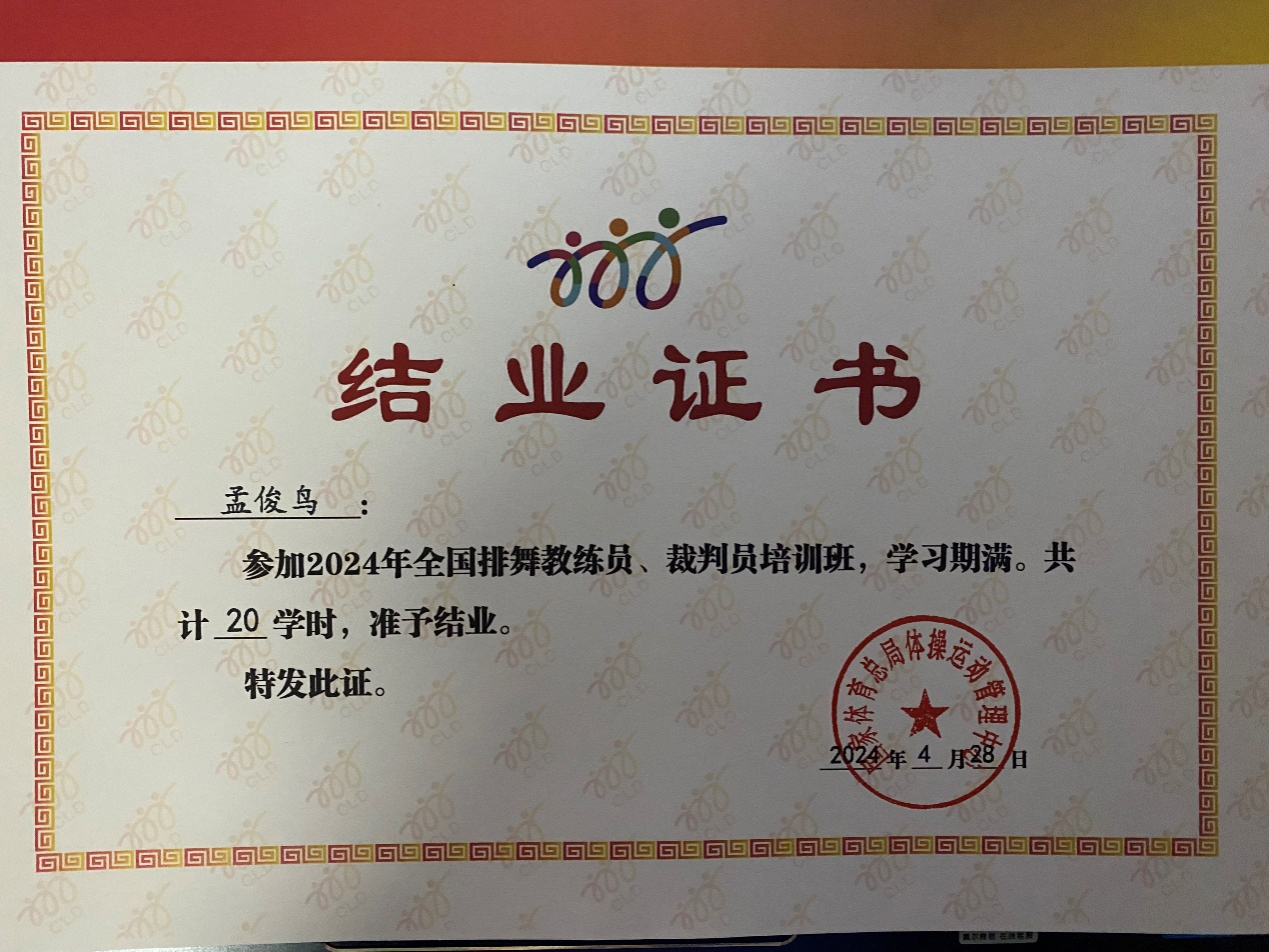 4月26-28日,公司beat365孟俊鸟老师参加由国家体育总局体操运动管理中心主办的2024年全国排舞教练员、裁判员培训班顺利结业。