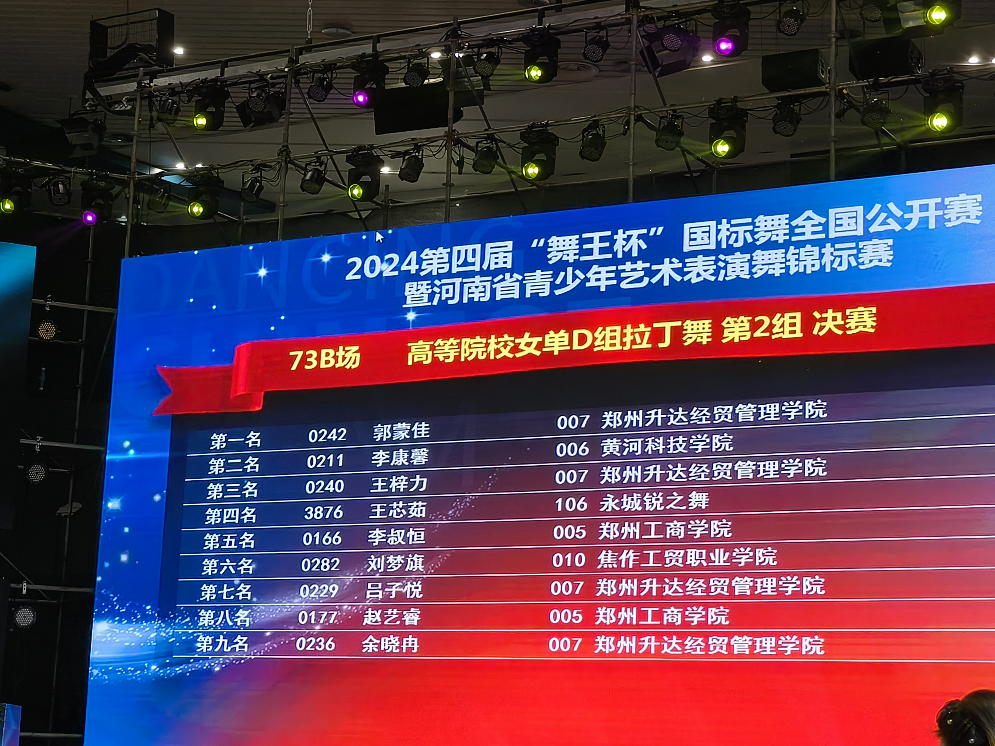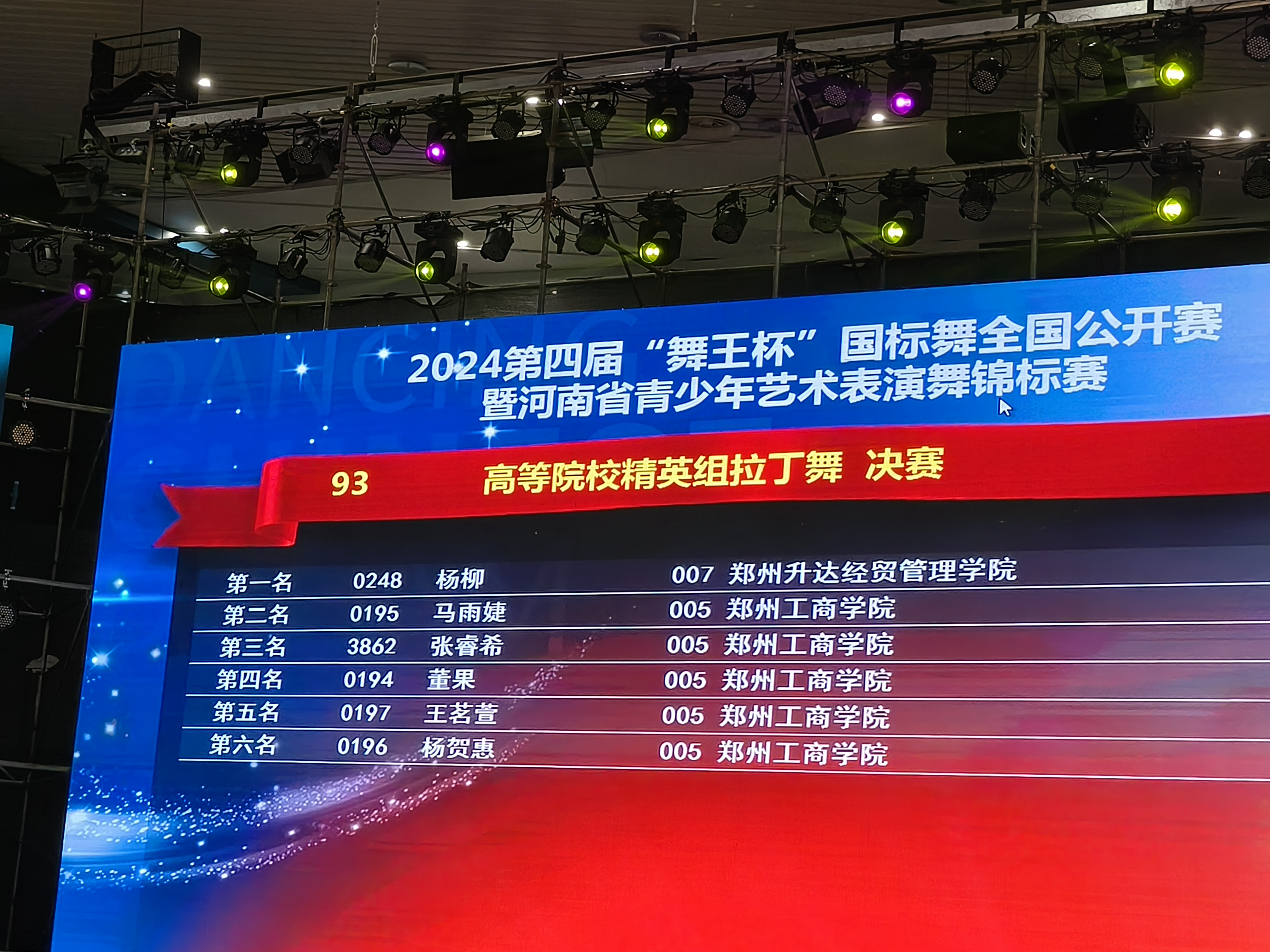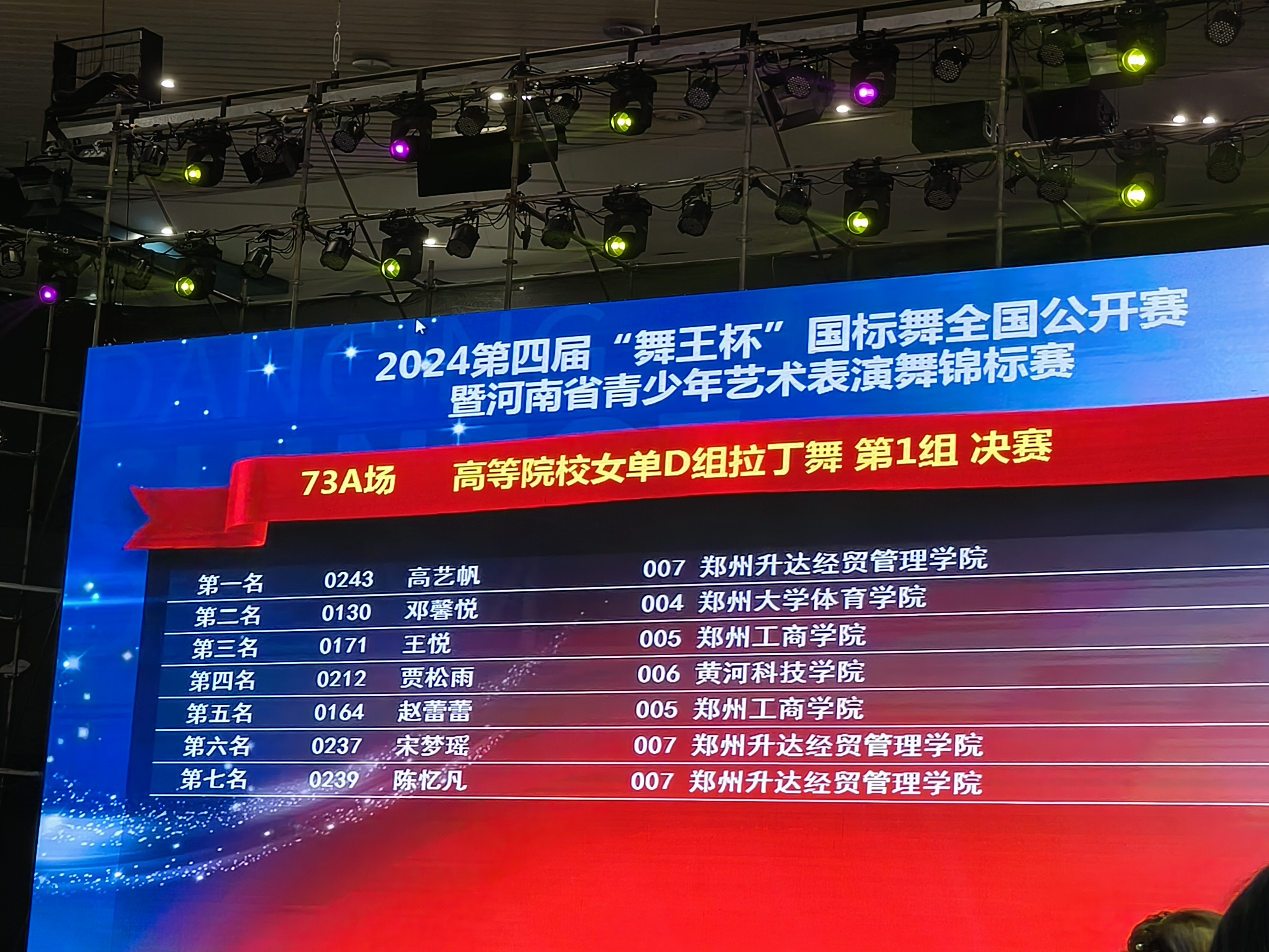 公司体育舞蹈专业43名同学参加了本次比赛。赵名扬、滕梅同学荣获高等院校B组摩登舞第一名;乔嘉瑞、李欣同学荣获高等院校C组摩登舞第一名;杨柳同学荣获高校院校精英组拉丁舞第一名;何港奥同学荣获高等院校精英组摩登舞第一名;段佳睿同学荣获高校院校女单A组拉丁舞第一名。
