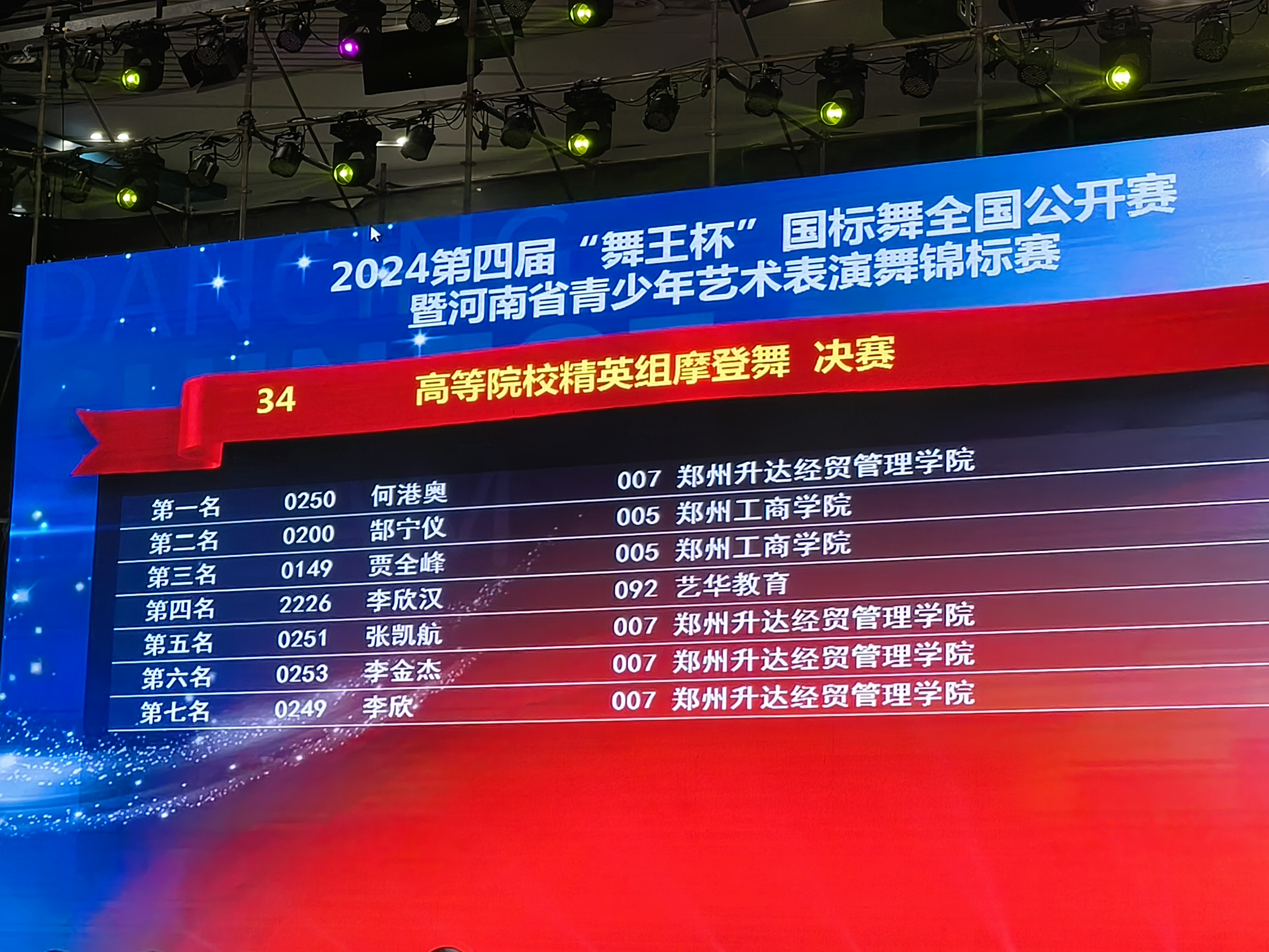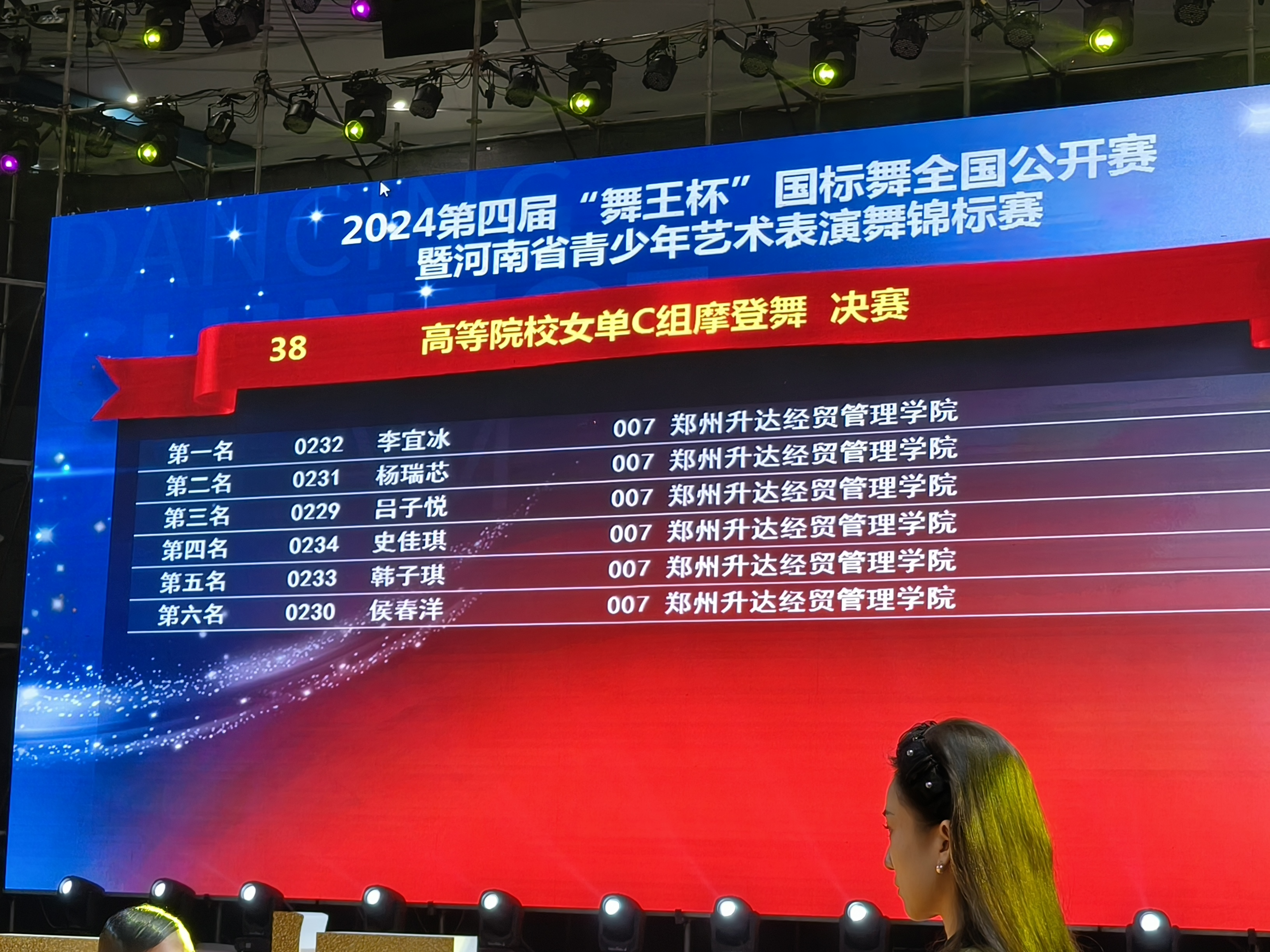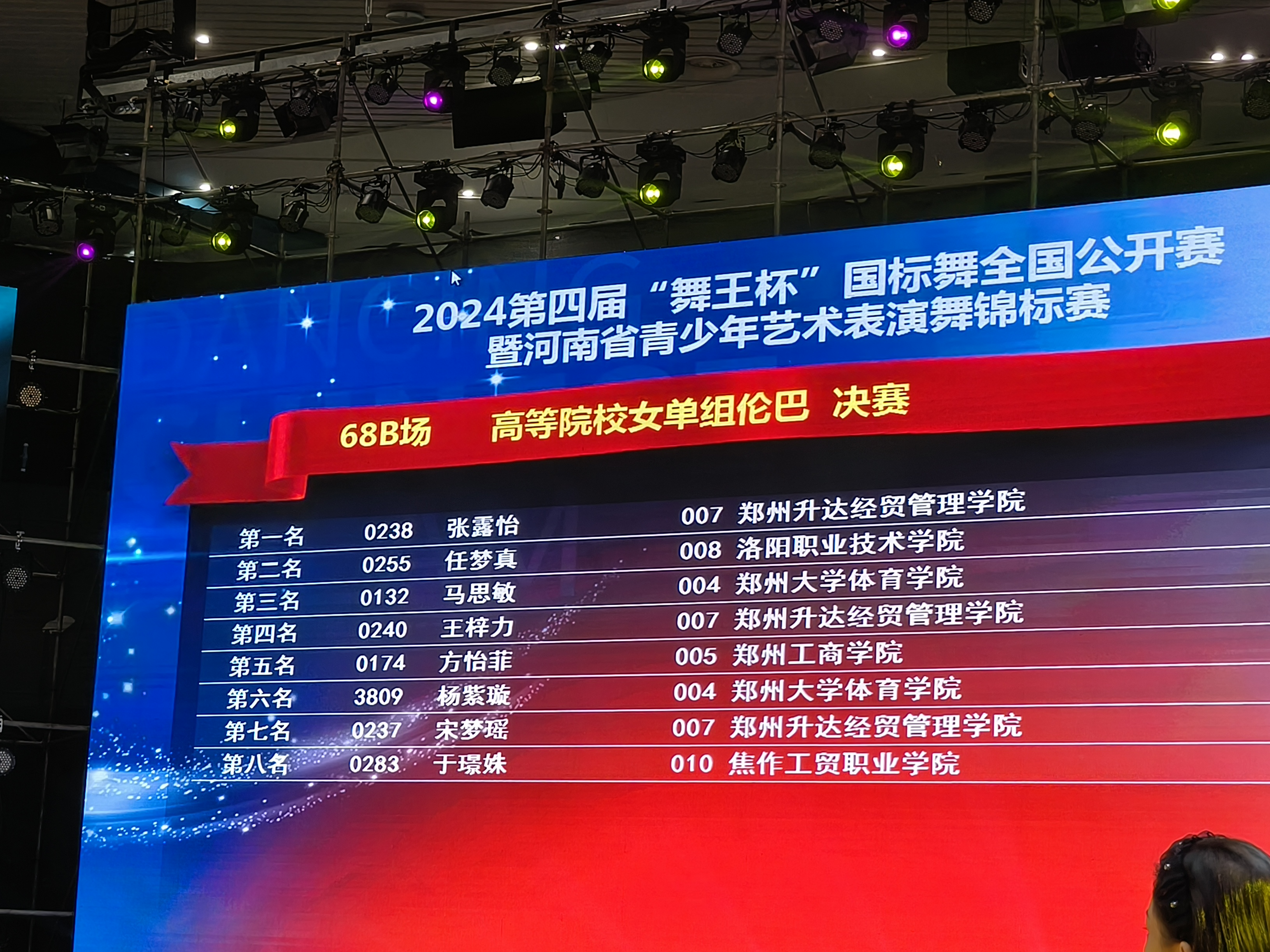 公司体育舞蹈专业43名同学参加了本次比赛。赵名扬、滕梅同学荣获高等院校B组摩登舞第一名;乔嘉瑞、李欣同学荣获高等院校C组摩登舞第一名;杨柳同学荣获高校院校精英组拉丁舞第一名;何港奥同学荣获高等院校精英组摩登舞第一名;段佳睿同学荣获高校院校女单A组拉丁舞第一名。