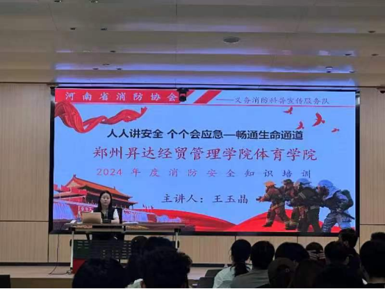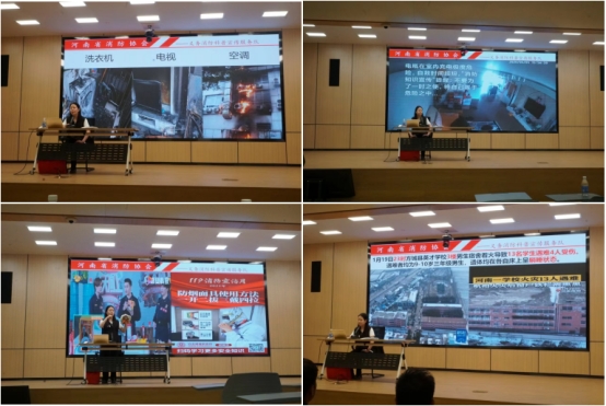 培训会上,王玉晶以案例分析切入,首先重点讲述了当前社会特别是高校面临的火灾风险隐患形势,结合近年来发生的火灾案例,以视频、图片、文字结合的形式普及消防安全知识,从“防火”、“灭火”、“逃生”、“自救”四个方面,详细介绍了火灾的形成过程、自救逃生的方法以及灭火器的种类和操作方法等。