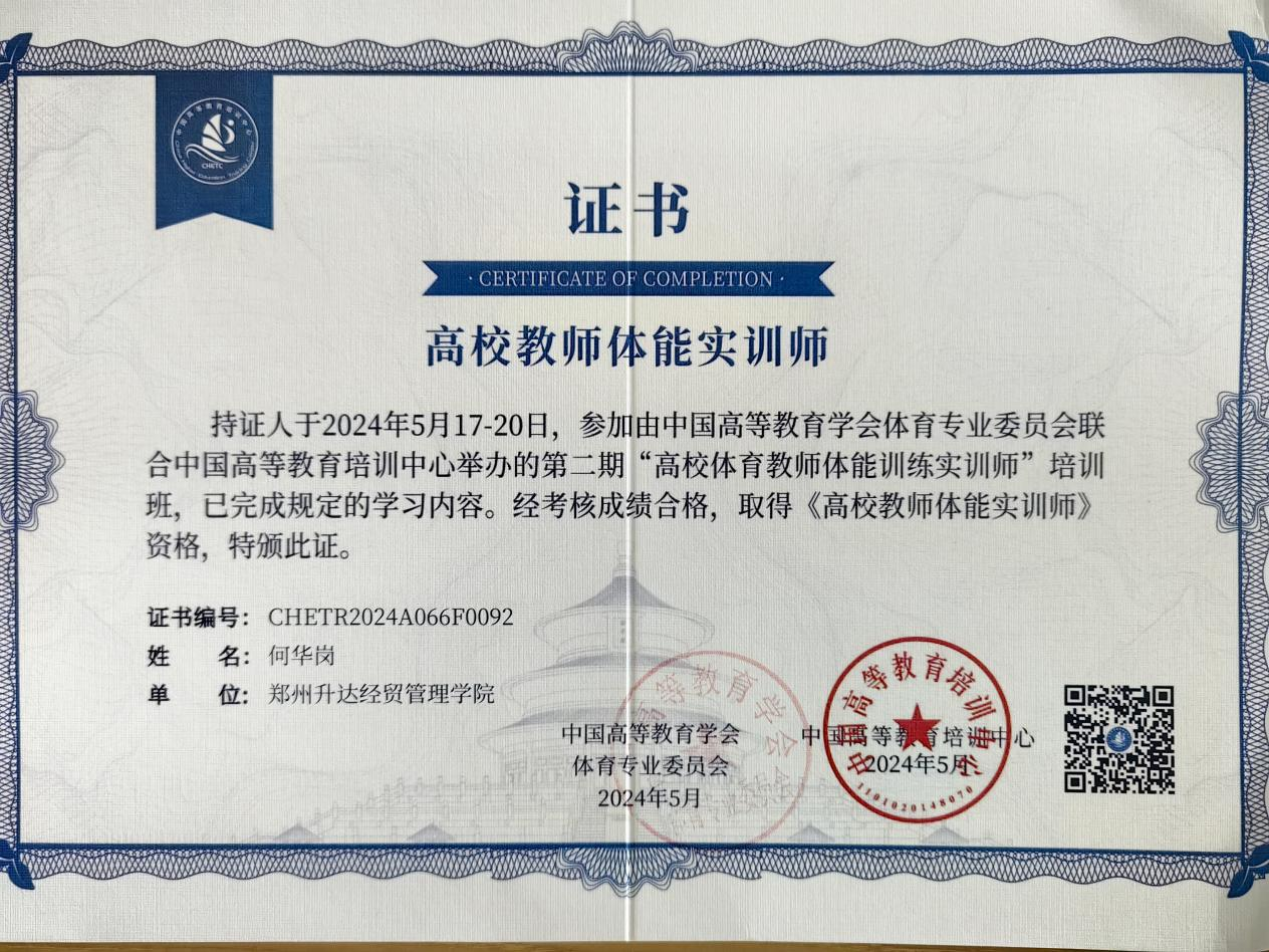 5月17-20日,公司beat365何华岗老师参加由中国高等教育培训中心主办的2024年全国高校体育教师体能培训师培训班顺利结业。