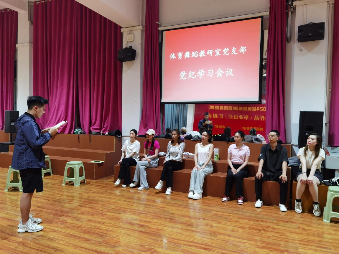 为深入开展党纪学习教育,全面准确把握《中国共产党纪律处分条例》的丰富内涵和实践要求,5月23日,体育舞蹈教研室党支部在体舞一厅举行专题学习会。