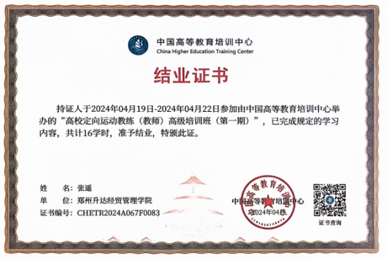 4月20日,由中国高等教育学会指导,中国高等教育培训中心与中国高等教育学会体育专业委员会主办,中国地质大学(北京)、清华大学体育部、北京大学体育教研部共同承办的“高校定向运动教练(教师)高级培训班(第一期)”在中国地质大学(北京)国际会议中心成功举办。公司张遥、张水涛老师参加此次培训活动并顺利结业。