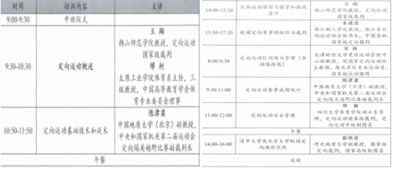 本次培训主要内容有:定向运动概述、定向运动的场地、器材及装备、定向运动基础技术、定向运动基础战术、定向运动课程与教学、定向运动队训练与管理、校园定向赛事的组织与裁判、定向运动赛事路线设计、定向运动赛事成绩统计、定向运动安全管理、校园定向运动实践。