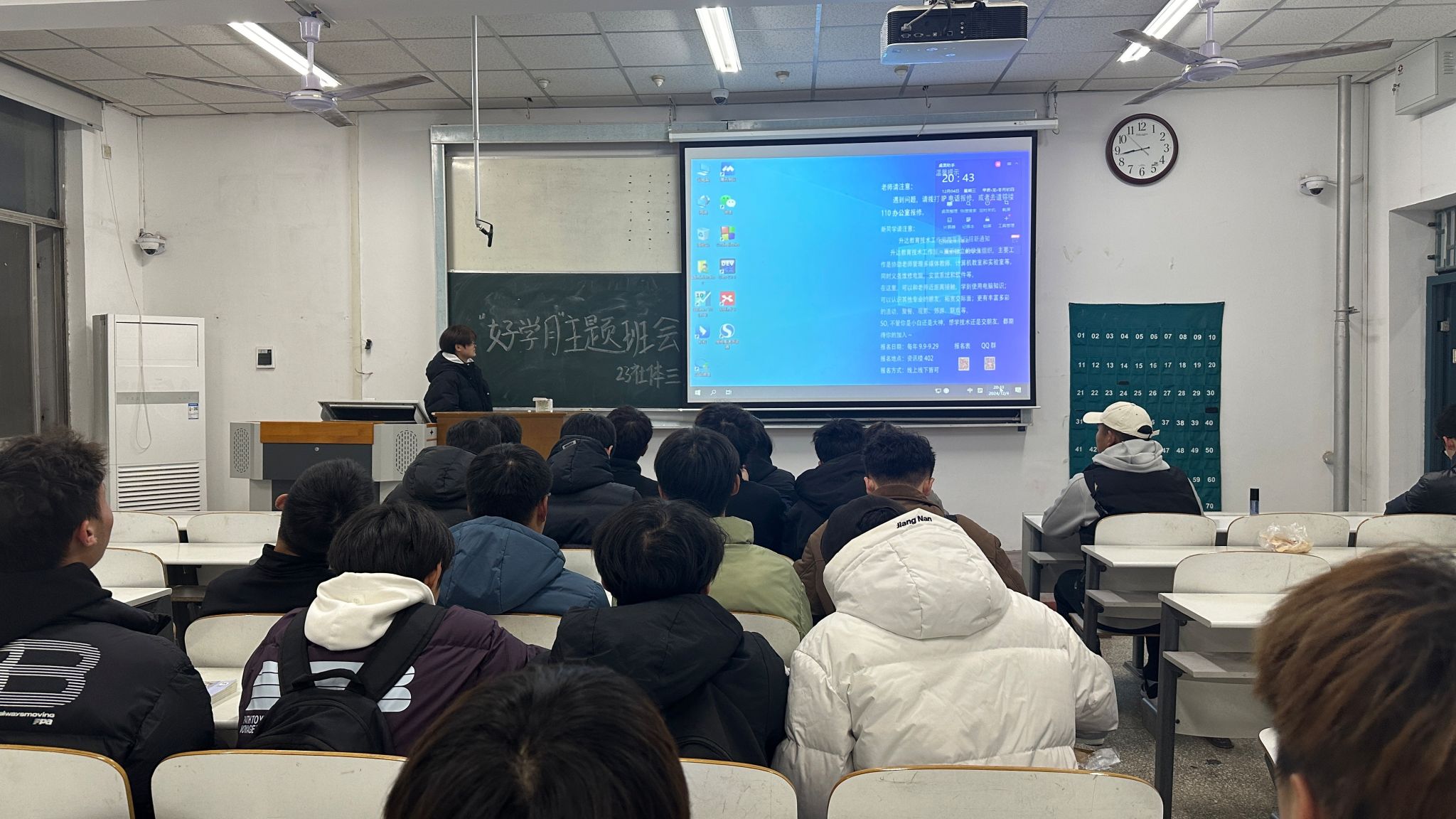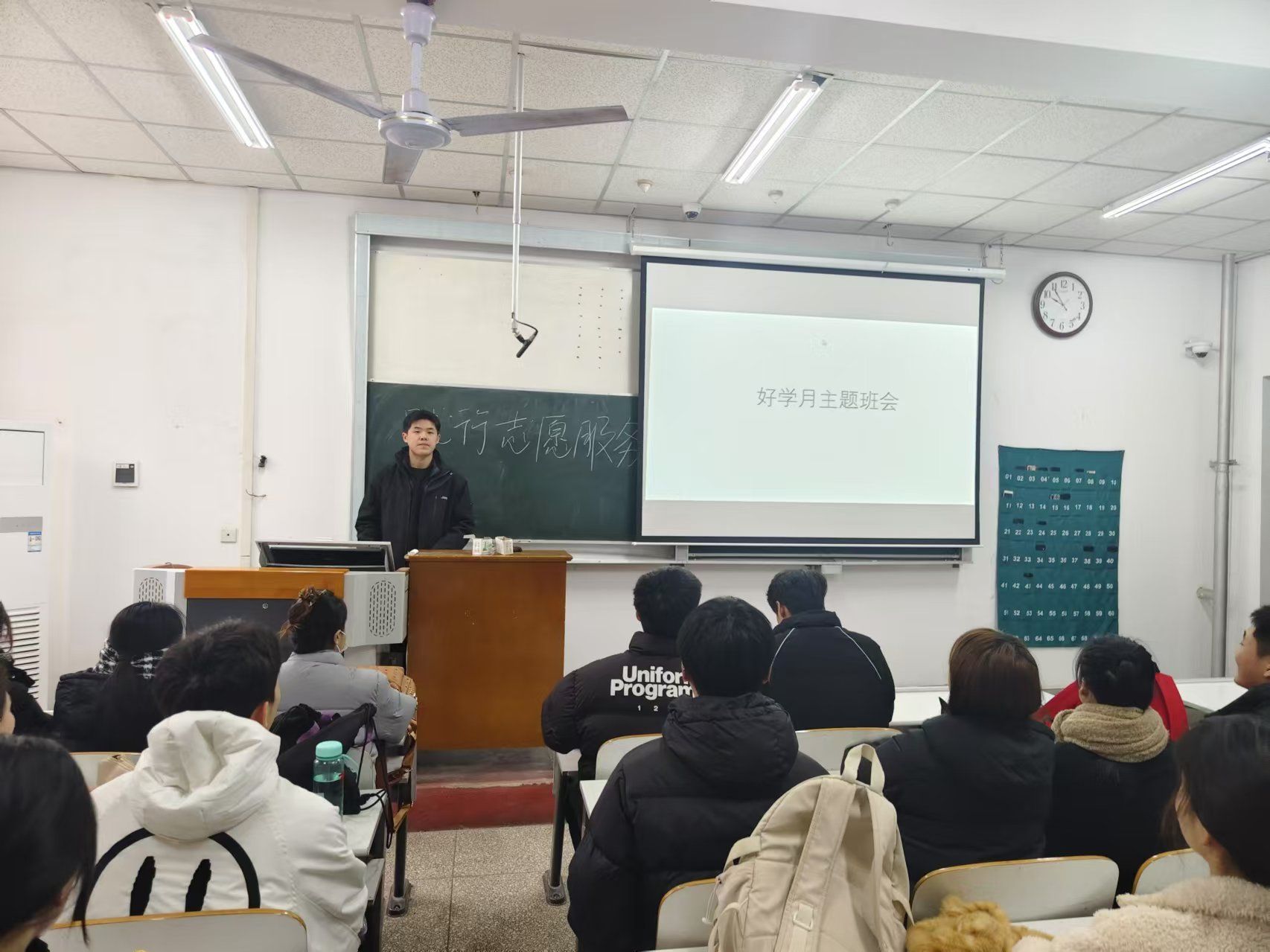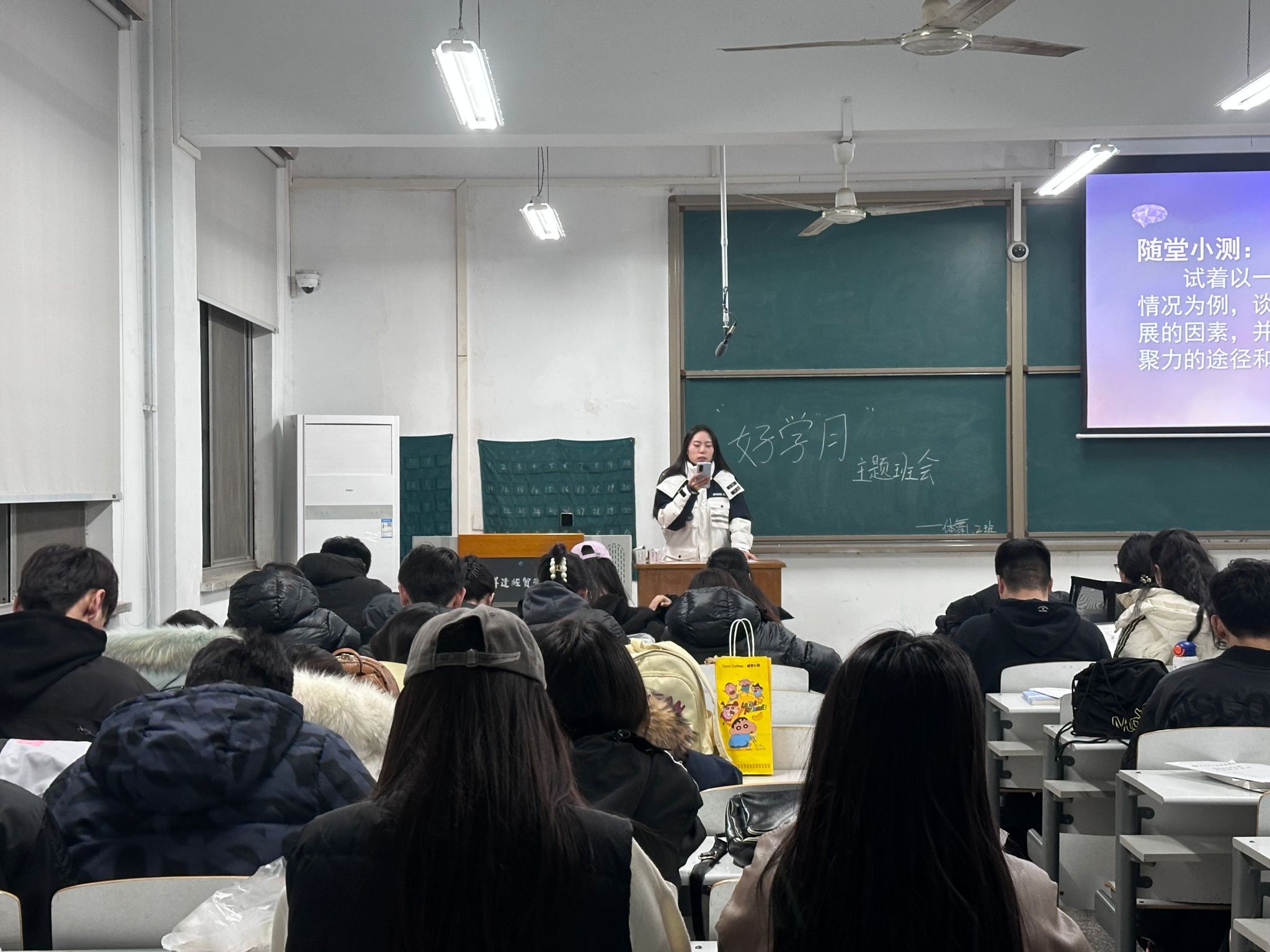 此次班会以“遵守课堂纪律,营造优良学风;倡导诚信考试,杜绝考试违规;增强身体素质,保证高效学习”为好学月活动主题,重点强调:一、端正思想、遵守法律法规和公司规章制度。二、遵守课堂纪律,做到“七不”、“八要”,做守规守纪的新时代老员工。三、增强身体素质,保证上课时间,实现高效学习。四、规范自学活动,督促员工合理利用课余时间。五、加强诚信教育,严肃考风考纪,杜绝考试违规,积极备考、诚信应考。