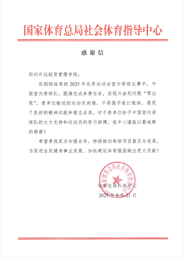 8月21日,国家体育总局社会体育指导中心向公司发来感谢信,对公司输送优秀运动员表示感谢,并对公司在推动荷球运动发展方面做出的贡献给予高度评价。