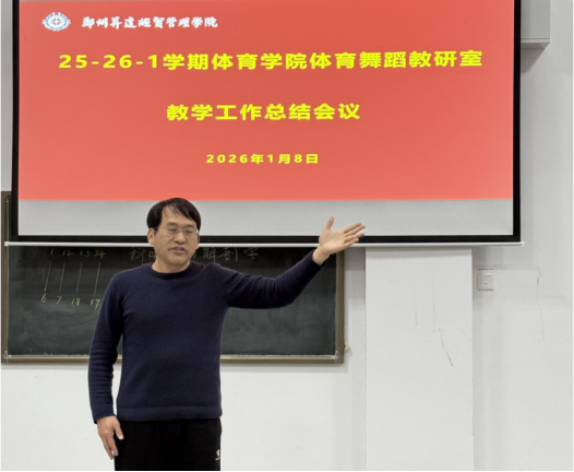 2026年1月8日,为全面梳理本学期教学工作成效,明确后续工作方向,进一步提升体育舞蹈教学质量与教研水平,2025-2026学年第一学期体育舞蹈教研室教学工作总结会议在体育馆多媒体教室顺利召开。教研室全体教师参会,会议由教研室主任栗元辉主持。